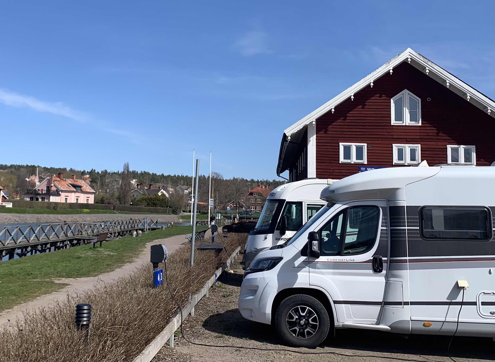 Nu blev det av. Ändå. Vi drog iväg trots att Olivia inte har något 12 V-system. EBL:en är kaputt och bortplockad. Vi har väntat i sex veckor på att verkstaden ska vara klar. Men nu väntar vi inte längre. Vi åker ändå och kopplar upp på stolpe med 230 V. Det får gå utan vattenpump och kylskåp. Vi har extra kylbox med. Vi hankar oss fram. Den skarpögde kanske ser att vi är vid Kaffeteriet i Borensberg. Välkänd adress för oss och bara drygt sju mil hemifrån. Så här sent har vi aldrig startat en husbilssäsong. Men tålamodet tröt.