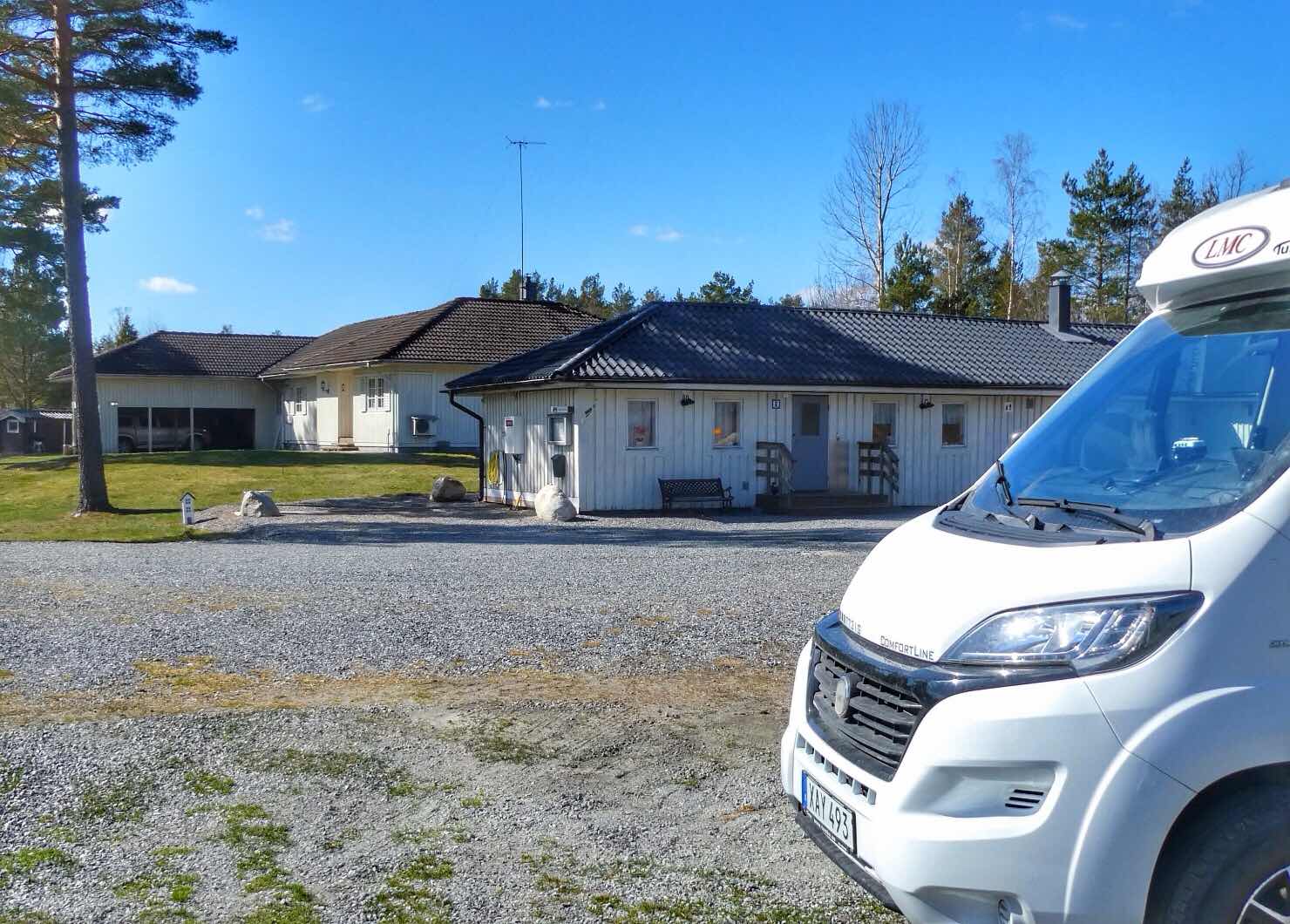 Vi trivdes så bra förra året vid Glofshult Västeräng, en ställplats långt ute på Vikbolandet, så vi återvänder gärna. Ställplatsen drivs av Aji Franzén, en tuff dam som gärna jagar vildsvin om nätterna. Slakteri finns i det som också är servicehus (närmast). Där finns också tömning av latrin och gråvatten. I det bortre huset bor Aji själv.
